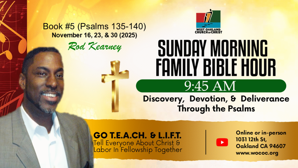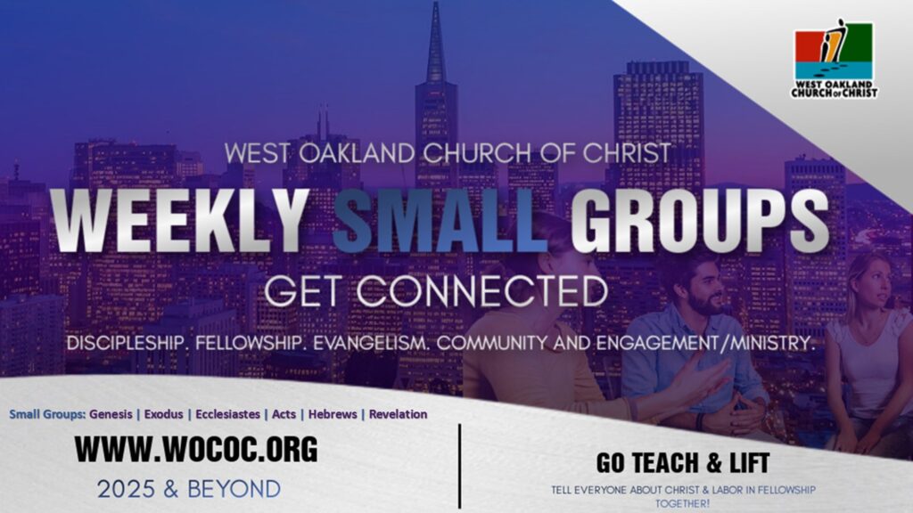 The people of the West Oakland Church of Christ are dedicated to a Small Group. The Small Groups convene weekly either on Wednesday of Thursday evenings. Beginning in February of each year, Small Groups meet in two month segments and the off months we convene for collective Bible study. The Small Group devotional content is connected to the AM Bible studies and the weekly sermon. See the Small Group image below for more information.